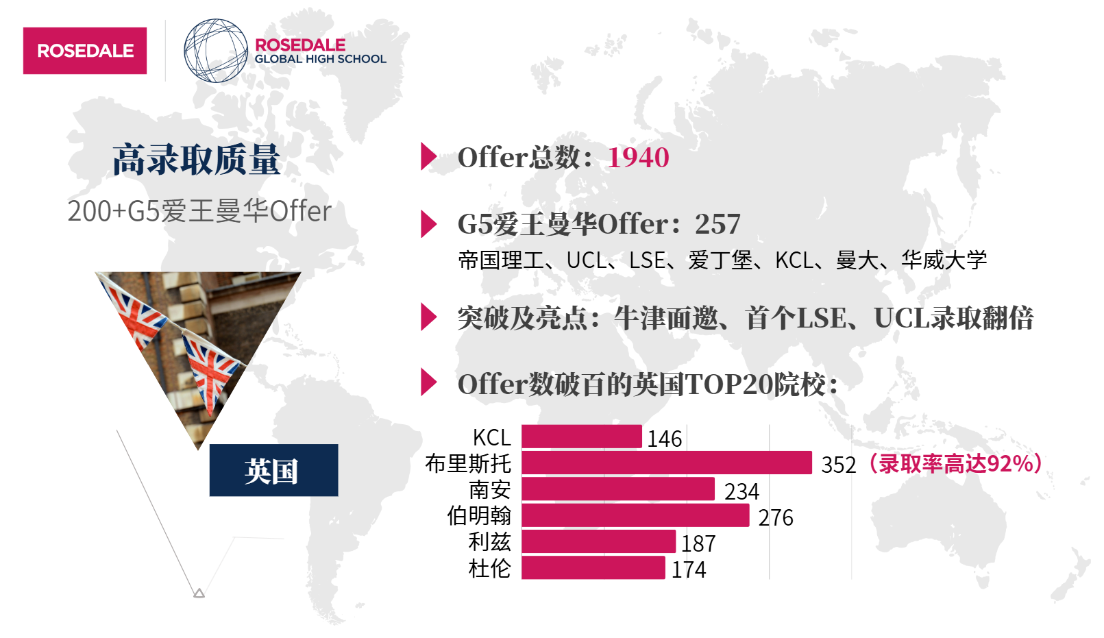 “G5愛王曼華”一向是衡量一所學校在英國方向認可度/含金量的最好證明,羅斯德全球高中學子共拿到了256個Offer。