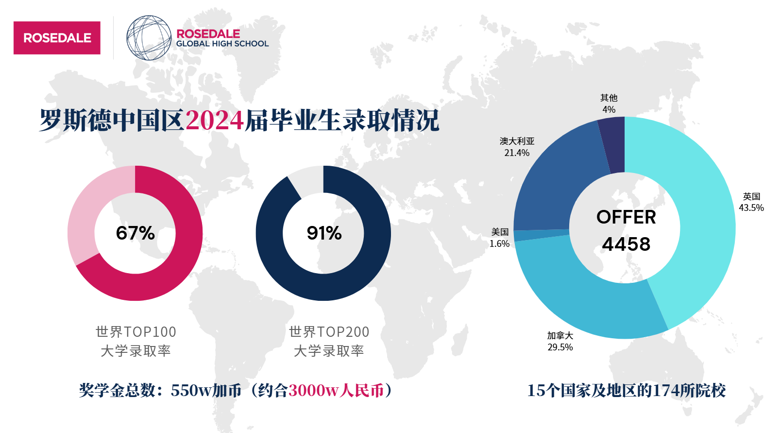 2023-2024學年,羅斯德全球高中24屆1253名畢業生,共收到來自15個國家及地區174所大學的4458封Offer,相較去年增加1182封,達到了辦學10年以來的歷史新高,可謂收獲滿滿!