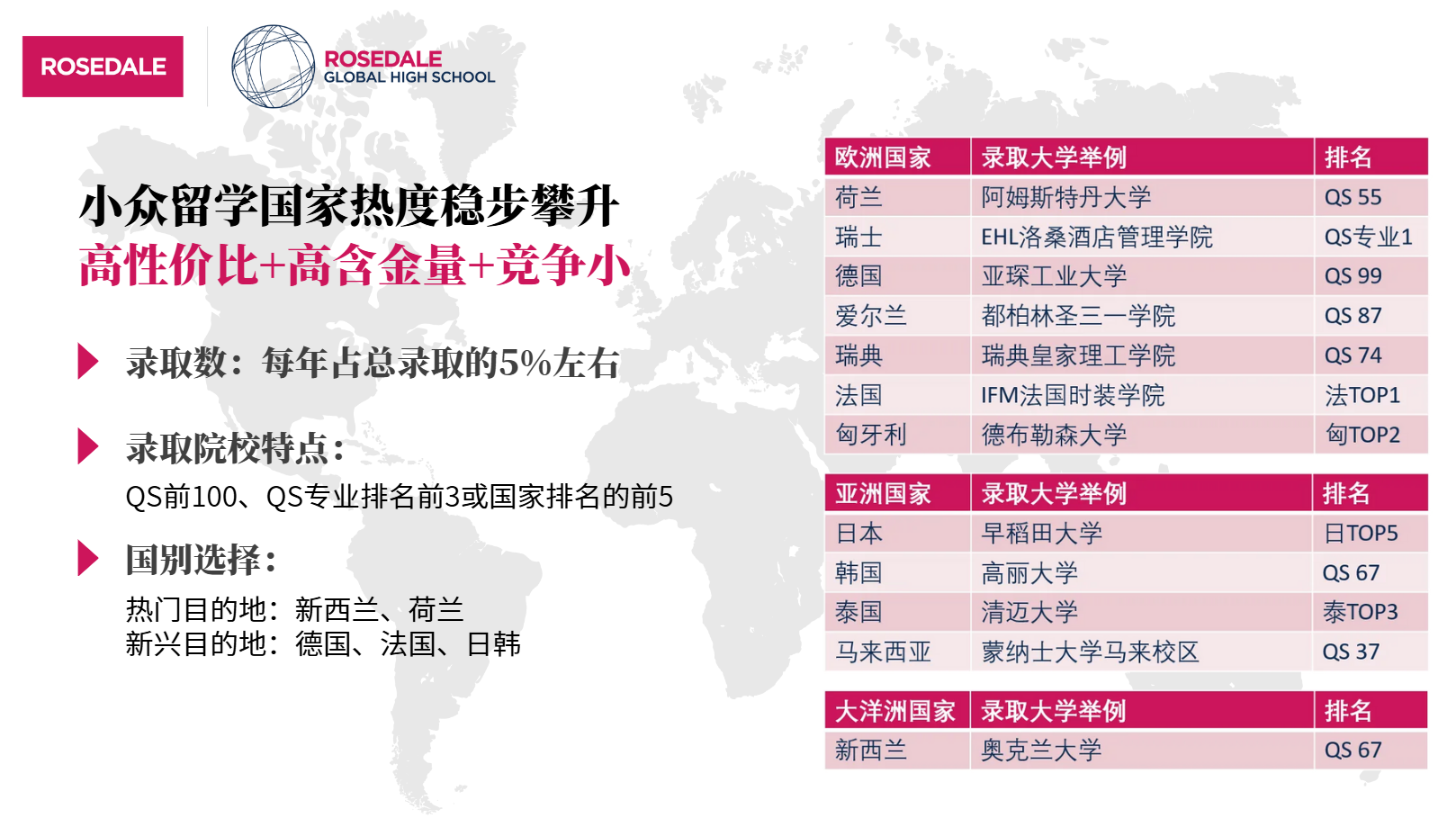 憑借高性價比+高含金量+申請競爭小,羅斯德全球高中小眾留學目的地國家的申請熱度也穩步攀升,約占總錄取的5%左右。數量不多,但Offer含金量非常高: