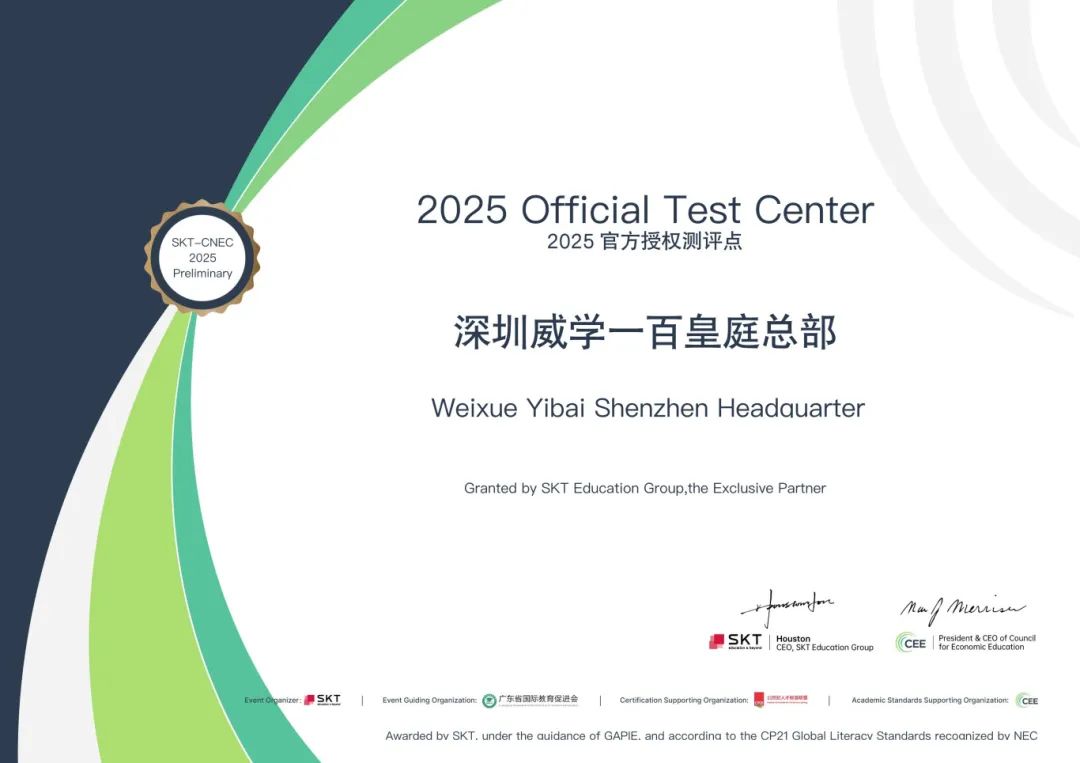 作為2025年CNEC官方授權測評點,威學一百將繼續致力于為學員提供高質量、高標準的教育測評服務。通過準確、公正的測評體系,我們不僅幫助學員客觀評估自身能力,更為他們未來的學術和職業發展提供有力支持。