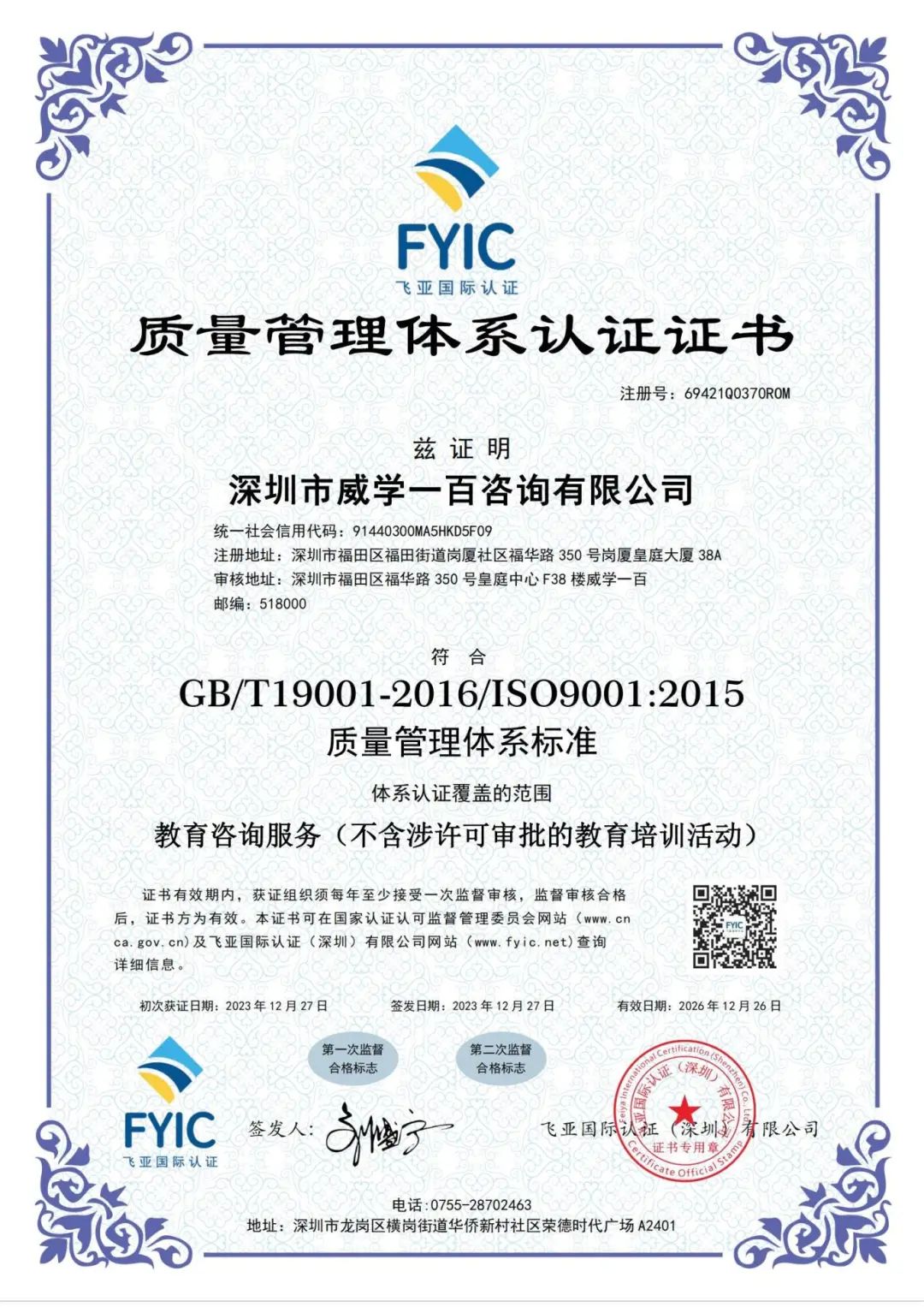 威學一百此次榮獲ISO 9001質量管理體系認證,不僅是對威學一百教育服務質量的權威肯定,更是對我們未來持續提升與創新的鞭策。威學一百將繼續秉持“全人教育”的理念,深化質量管理體系建設,不斷創新教育產品與服務模式,為學員提供更加優質、高效、個性化的國際教育咨詢方案,邁向新的質量高地。