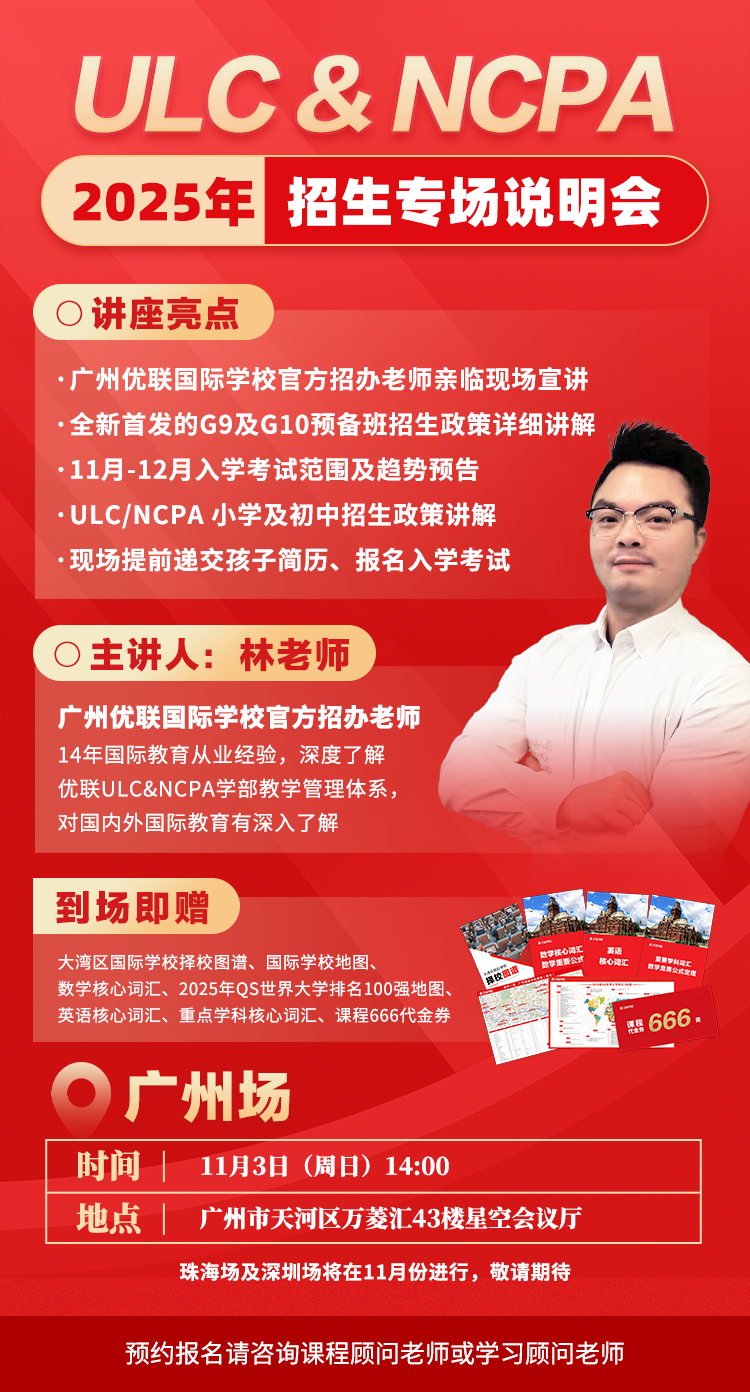 ULC&NCPA2025年招生專場(chǎng)說明會(huì)來啦!11月3日(周日)下午14:00,廣州天河萬(wàn)菱匯校區(qū)!官方招辦主任親臨現(xiàn)場(chǎng)面對(duì)面直擊最新的招生政策及入學(xué)考試內(nèi)容!意向參加11月/12月考試的同學(xué)千萬(wàn)不要錯(cuò)過咯!名額有限,趕緊聯(lián)系我預(yù)約搶位吧!