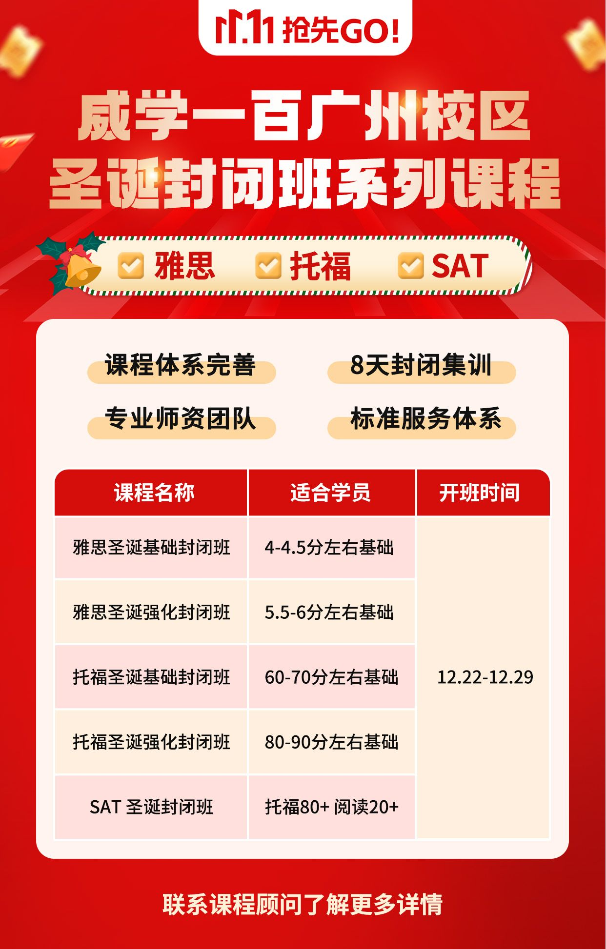 威學一百廣州「雅思/托福/SAT圣誕封閉班」12.22開課!8天封閉集訓,逼出更強大的自己!趕緊私我搶位啦~