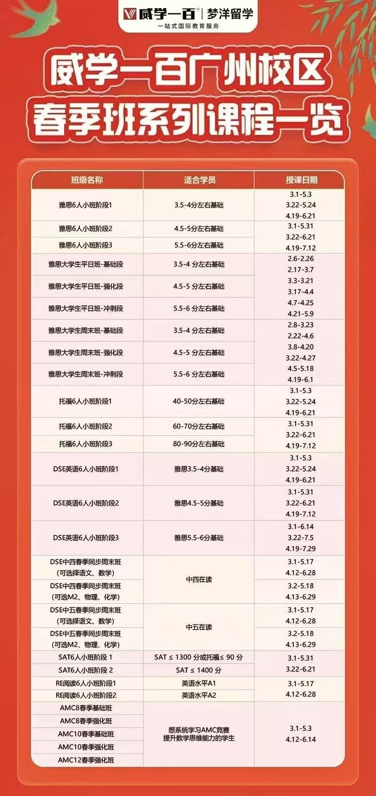 威學一百廣州校區春季班火熱招生中!雅思/托福/DSE/RE/AMC等熱門課程應有盡有,適配各階段學員需求!快來戳我了解課程詳情啦~