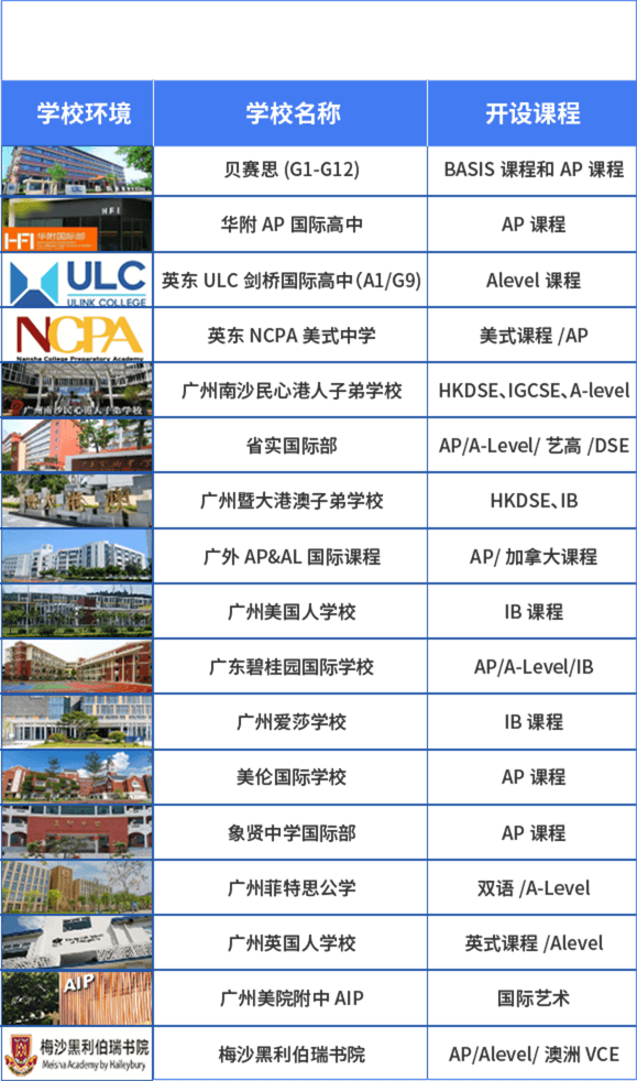 | 課程內容 | 必修課為:語文、數學、英語、通識教育;選修課有20科可供選擇,包括:物理、化學、生物、歷史等。 | 數學、物理、化學、生物、地理、歷史、哲學、語言類、政治學、經濟學等 | 藝術類、英語類、歷史與社會科學類、數學與計算機科學類、自然科學類、世界語言與文學類,以及頂石文憑項目類 | 語言A(母語)、語言B(習得語言)、個人與社會學、實驗科學、數學、藝術與選修 | 語言類、人文和社會科學類、科學類、數學類等 | 英語、數學、科學、藝術、英語課、商科課程、計算機專業等 |